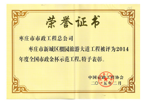 “棗莊市新城區(qū)榴園旅游大道工程”被評為2014年度全國市政金杯示范工程