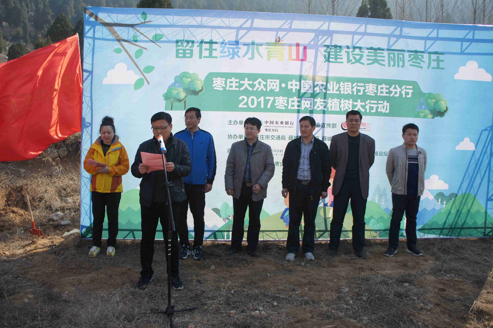 在市農(nóng)業(yè)局的專業(yè)技術(shù)人員的指導(dǎo)下,參加植樹活動的同志們,自覺分工、各司其職,大家挖坑、扶苗、填土、澆水……忙的不亦樂乎。盡管天氣有些冷,但是大家的熱情更加高,許多人額頭上都掛著汗珠,但當(dāng)大家看著自己親手種下的小樹苗時(shí)便忘記了勞累。在活動最后,志愿者們在獵獵招展的棗莊市政大旗和共青團(tuán)團(tuán)旗下,一起與自己親手種下的樹苗合影留念。